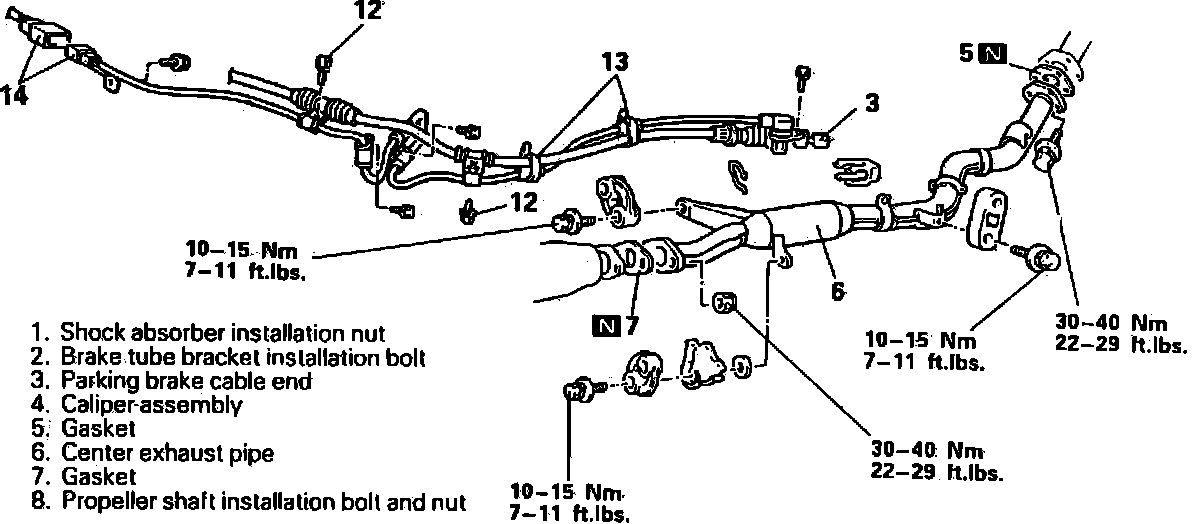 10. Lower jack, then remove rear suspension assembly from body. Ensure propeller shaft does not bend excessively and joint does not receive any shock.