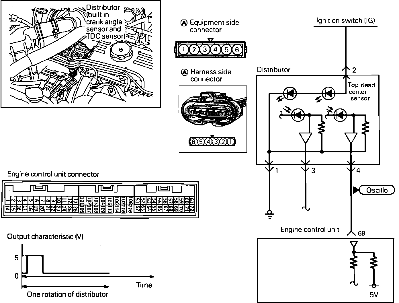 1. Connect test leads from the oscilloscope to the #4 terminal of the sensor connector and run the engine at idle speed.