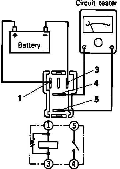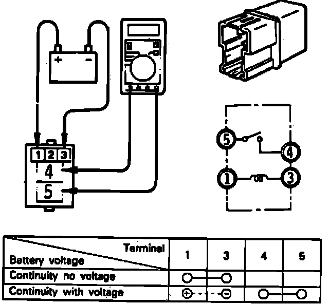 2. Remove battery voltage from relay and check for continuity between terminals 1 and 3, continuity should exist, then check between terminals 4 and 5, continuity should not exist.