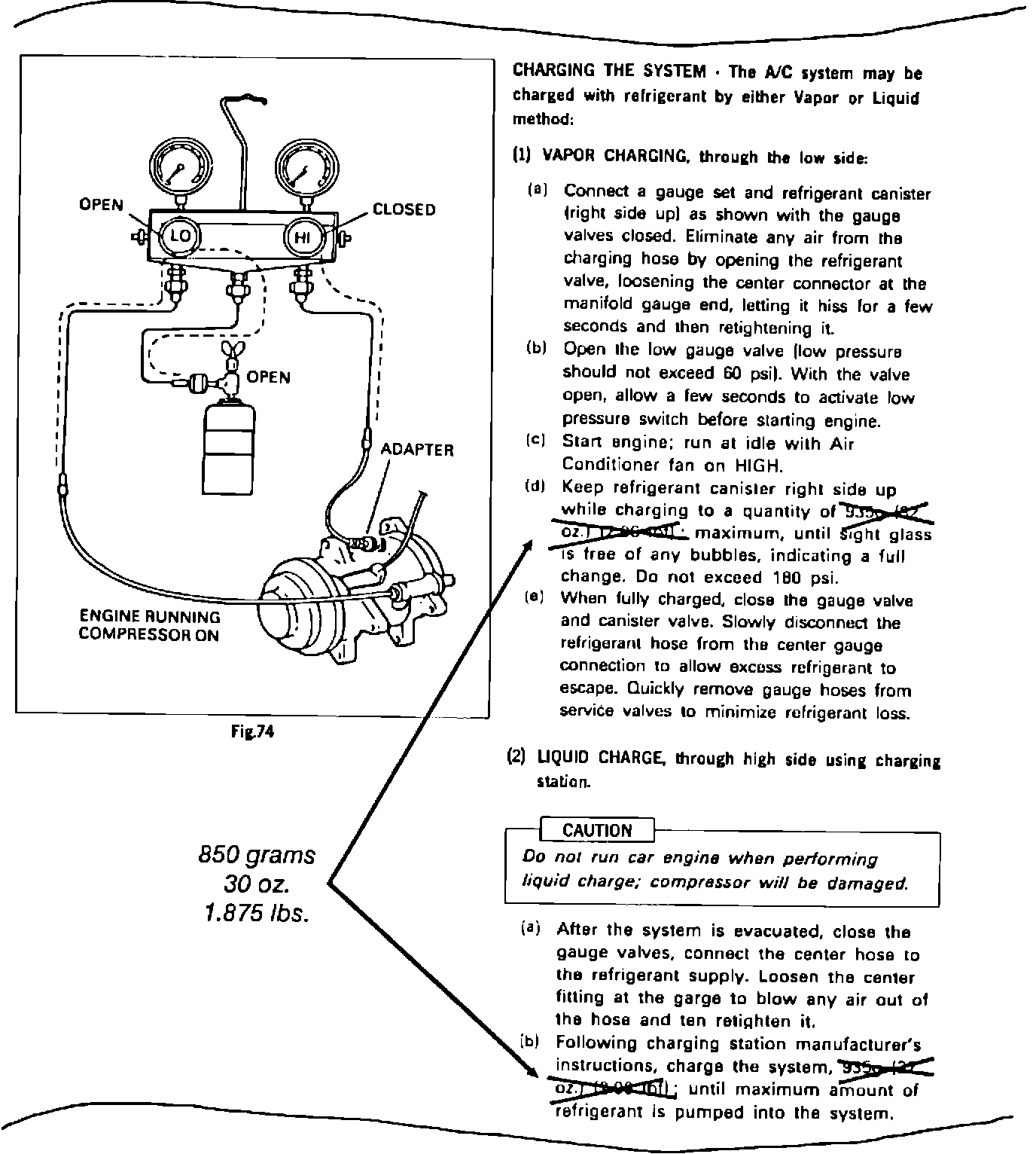 This Technical Service Bulletin corrects the refrigerant capacity shown in the Expo A/C Installation manual. The correct capacity is 850g (30 oz). The under-hood label in the A/C kit also shows the correct refrigerant capacity of 30 oz.