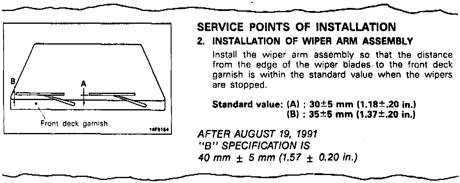 This bulletin changes the windshield wiper arm installation (B) specification for vehicles manufactured after August 19, 1991. The new passenger side wiper arm "outer" edge specification (B) is: 40 mm +/- 5 mm (1.57 +/- 0.20 in.).