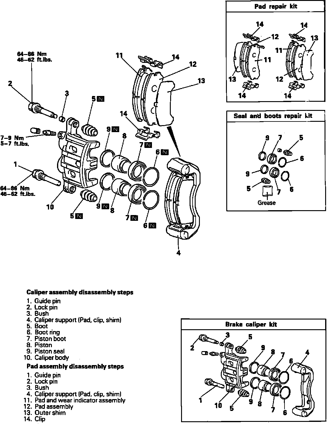 7. Apply a coating of suitable grease to the pad and anti-squeak shim contact surface and to the anti-squeak shim and inner shim contact surface. Ensure that grease does not come in contact with brake pad assemble.