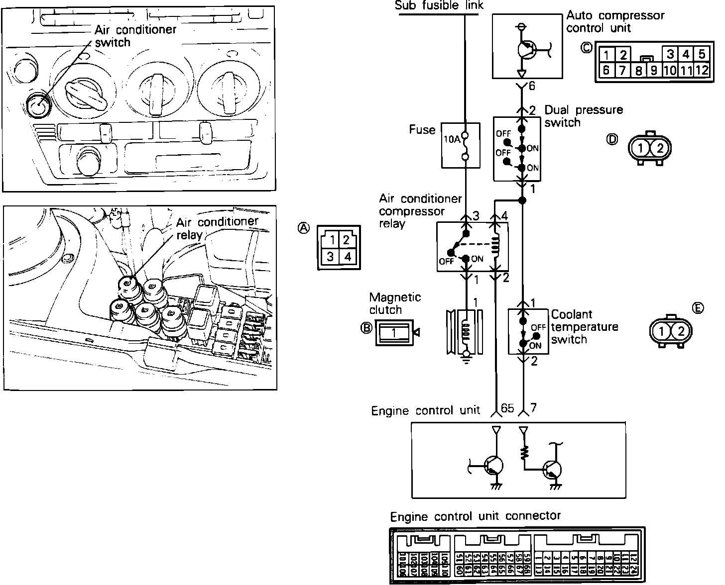 When the driver turns on the A/C system, and the engine temperature is below 238° F, a positive Voltage signal is supplied to the ECU (as an indication that the A/C system is needed) and to one side of the A/C relay coil. The ECU determines if engine conditions are suitable for A/C operation (idle speed, ignition timing and air/fuel mixture). If the ECU senses that conditions are suitable for A/C operation, it supplies the ground circuit for the A/C relay coil, energizing it. This allows the relay to supply Voltage to the compressor clutch.