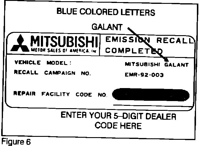 1. Two Emission Recall Completed Labels are contained in the emission parts kit. For this recall, choose the label with "MITSUBISHI GALANT, printed on it. Discard the other unused label!