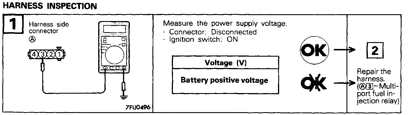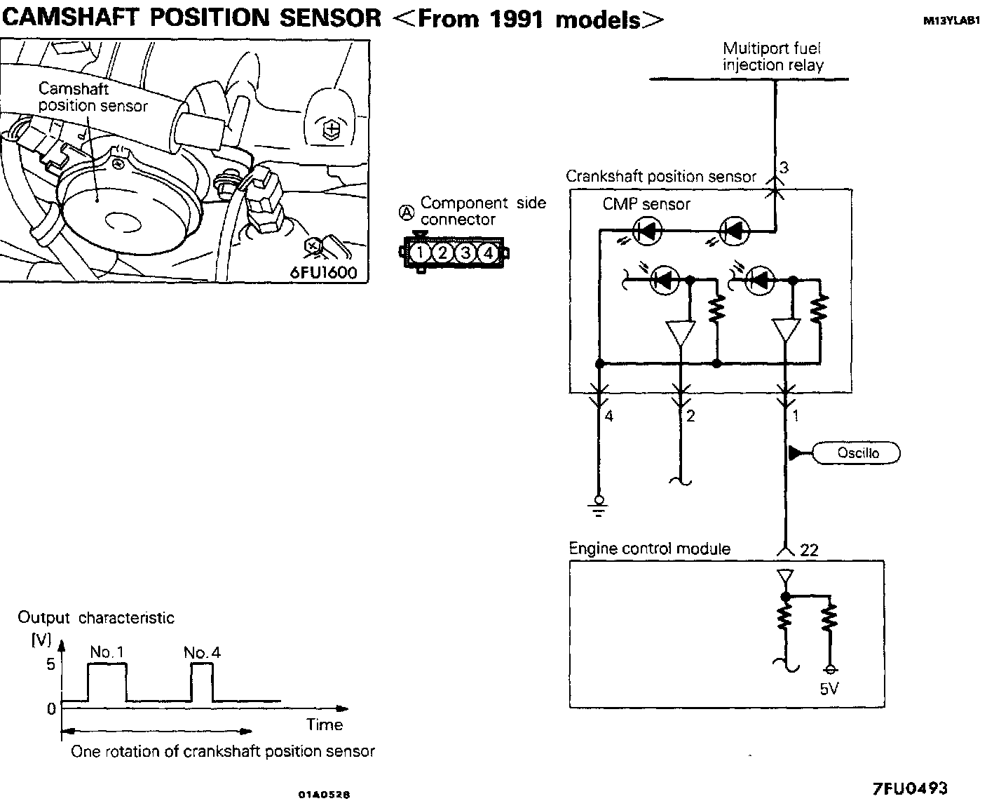 The power for the camshaft position sensor is supplied from the multiport fuel injection relay and is grounded to the vehicle body. The camshaft position sensor, by intermitting the flow (to ground) of the 5V Voltage applied from the engine control module produces pulse signals.