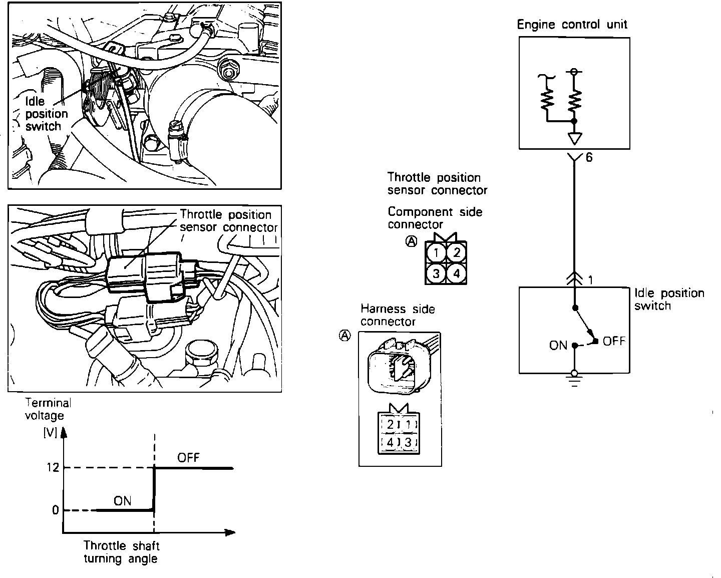 2. Make sure that the idle switch is depressed and check for continuity between terminal 1 and the body ground. If there is no continuity the switch must be replaced.