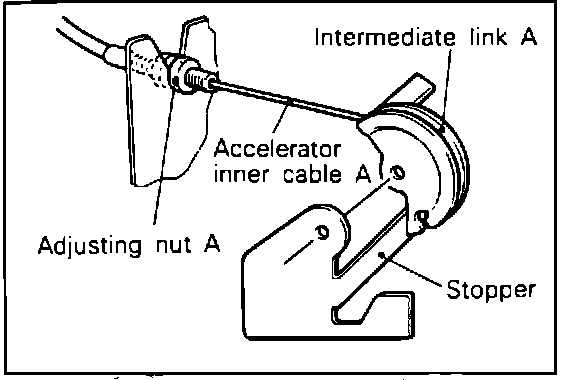 5. Next, adjust accelerator cable A in and out movement (accelerator pedal side) using the adjustment nut. With the intermediate link A of the actuator held against the stopper, turn the adjusting nut to remove slack. At the point that the cable becomes tight, back off the nut approx. two turns and secure with the lock nut