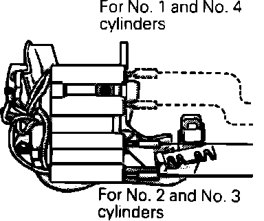 The primary winding is connected directly to the ignition switch (+) and the power transistor (-). The secondary winding is connected to the coil output tower through the iron core.