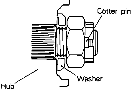 b. After installing wheel, lower vehicle to ground and finally tighten wheel bearing nut. If position of cotter pin holes do not match, torque nut up to 188 ft. lbs. maximum to align holes.