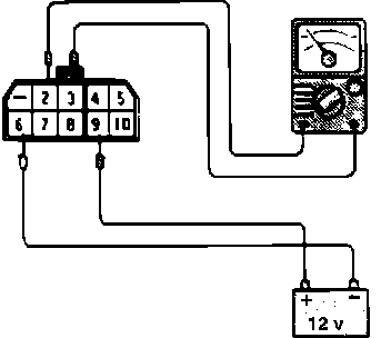 3. Supply 12 VDC to relay terminals 7 (-) and 3 (+). Using a Voltmeter, check for Voltage between terminals 2 (+) and supply battery ground terminal. Refer to Fig. 3.