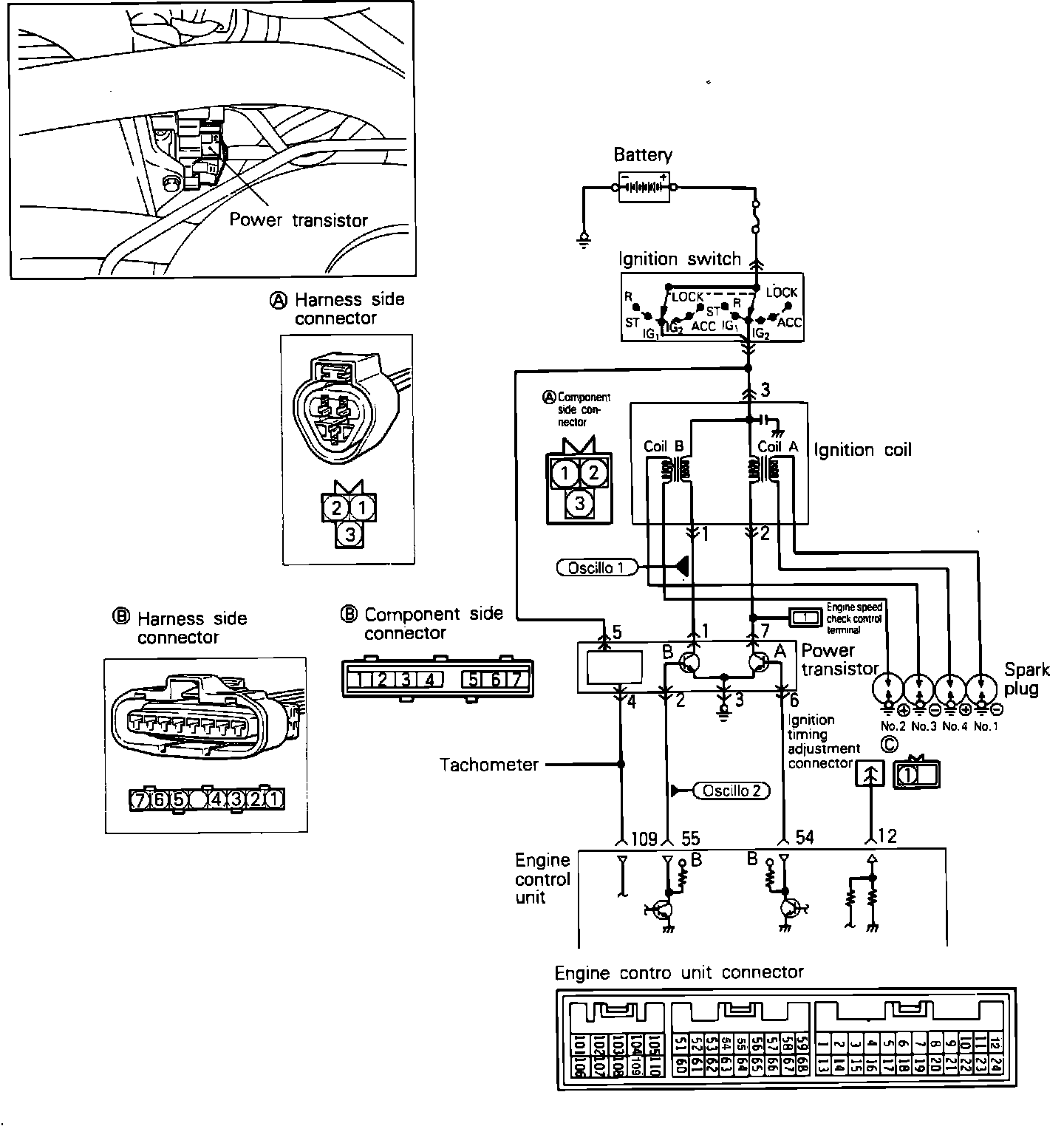 3. Turn the key to the OFF position and disconnect the negative battery cable and ECU connector. Using an Ohmmeter, check for continuity between the transistor harness connector terminal 4 and ECU harness connector terminal 109.
