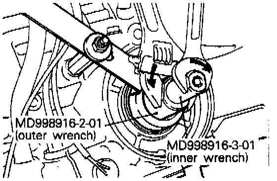 6. Engage the special tool (MD998916-2-01 outer) on the lock nut. Rotating the outer cylinder counter clockwise and the inner cylinder clockwise, lock the locking nut and special tool (MD 998916-3-01 inner).