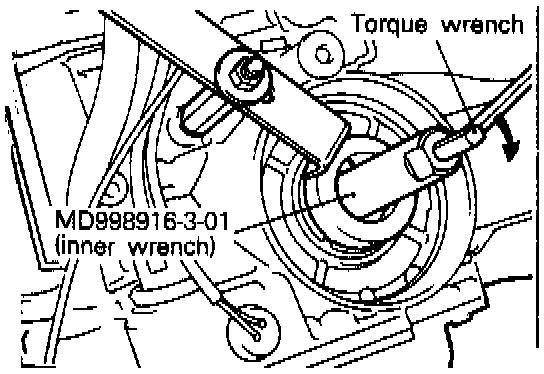 7. Attach the torque wrench to the special tool (inner), and repeat "tightening" and "returning" at a torque of 10 Nm (7.2 ft.lbs.) two times. Then, tighten it to a torque of 5 Nm (3.6 ft.lbs.). Then, back off the special tool (inner) 2 to 21/4 turns.