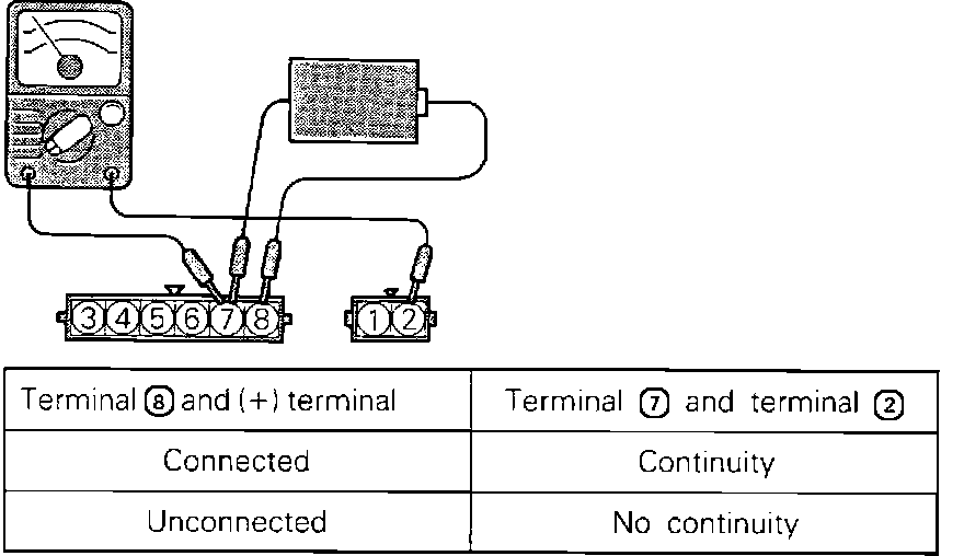 7. Using a voltmeter, check the voltage between ignition timing adjustment connector terminal 1 and ground.