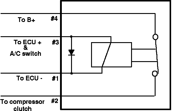 The relay is electromechanical. The ECU monitors the A/C on signal from the switch to the relay. When voltage is supplied from the switch to the relay coil, the ECU supplies the ground circuit to the relay coil (if conditions are suitable). This energizes the relay, closing the contacts.