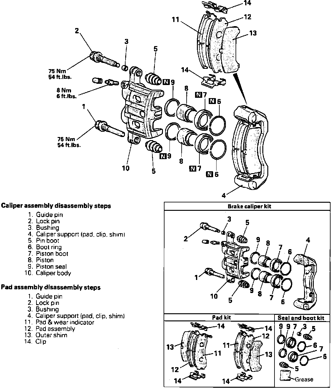 4. Reverse numbered sequence in Figs. 1 and 3 to assemble caliper. On FWD models, match guide and lockpins identification marks with marks on caliper body when installing.
