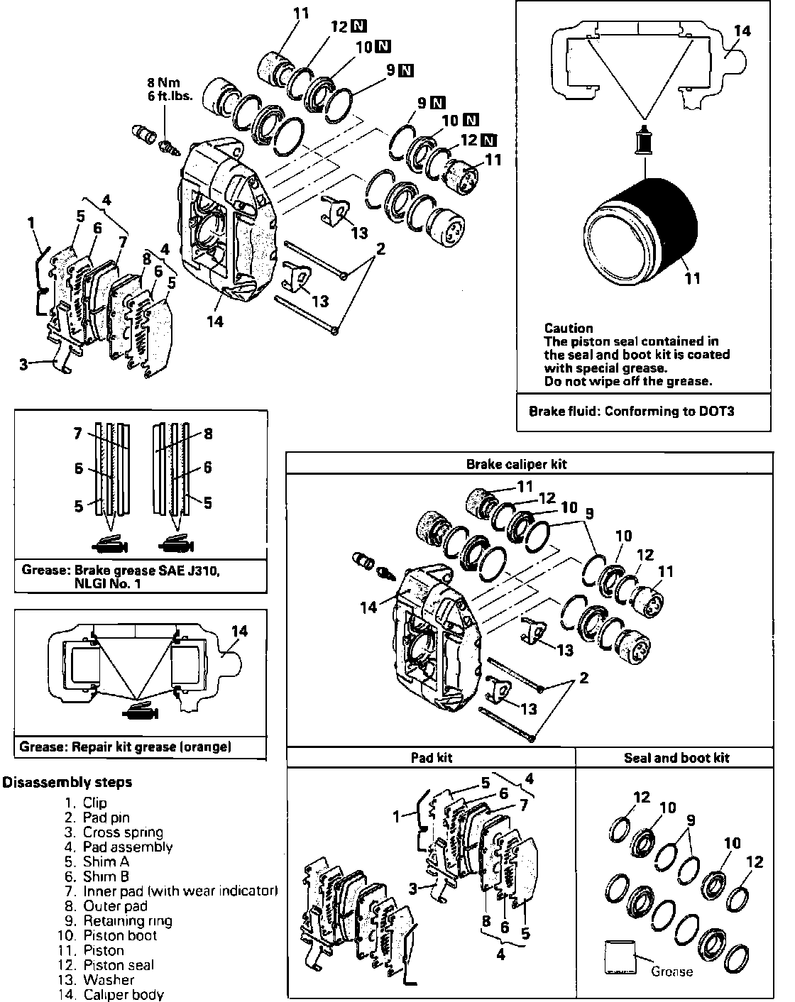 3. Disassemble caliper assembly in numbered sequence shown in Figs. 1 and 3, noting the following: