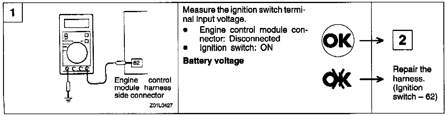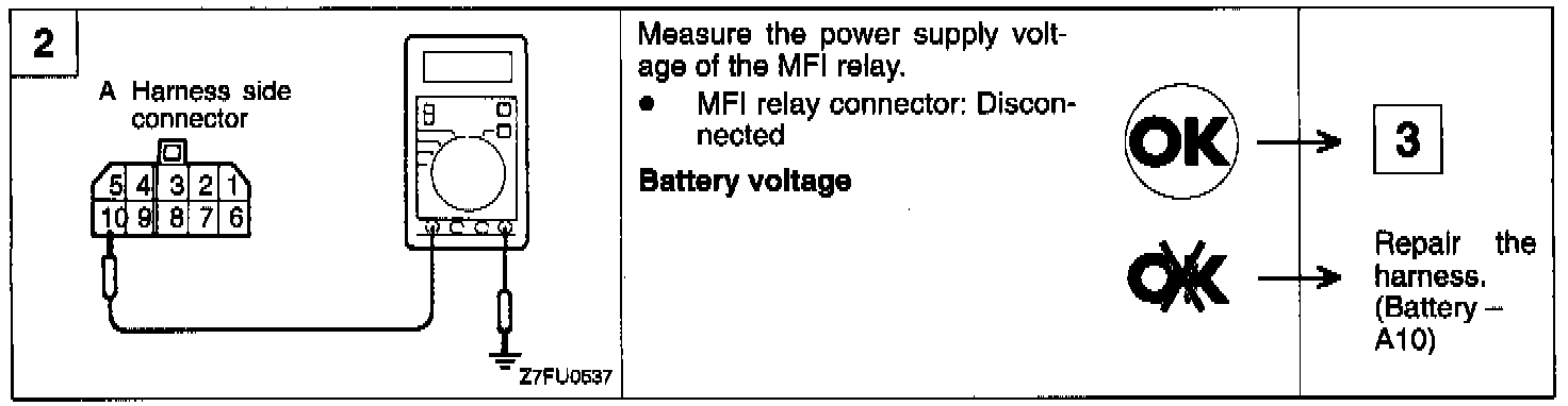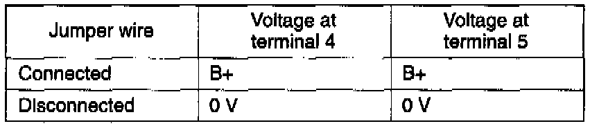 (7) Connecting and disconnecting the jumper wire to battery (-) terminal, measure the voltage at terminal (2) of the MFI relay.
