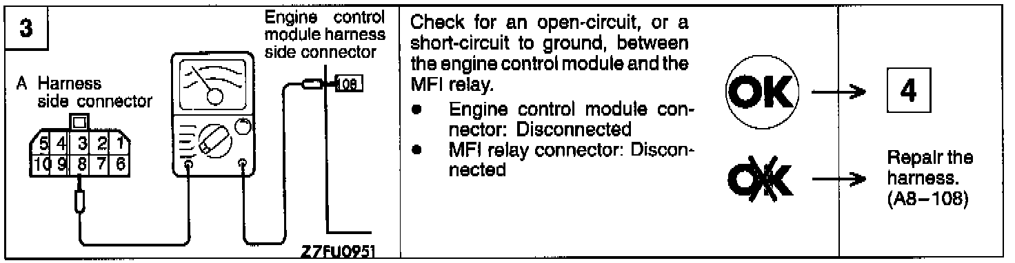 (5) Connecting and disconnecting the jumper wire to battery (-) terminal, check the continuity across terminals (2) and (3) of the MFI relay.