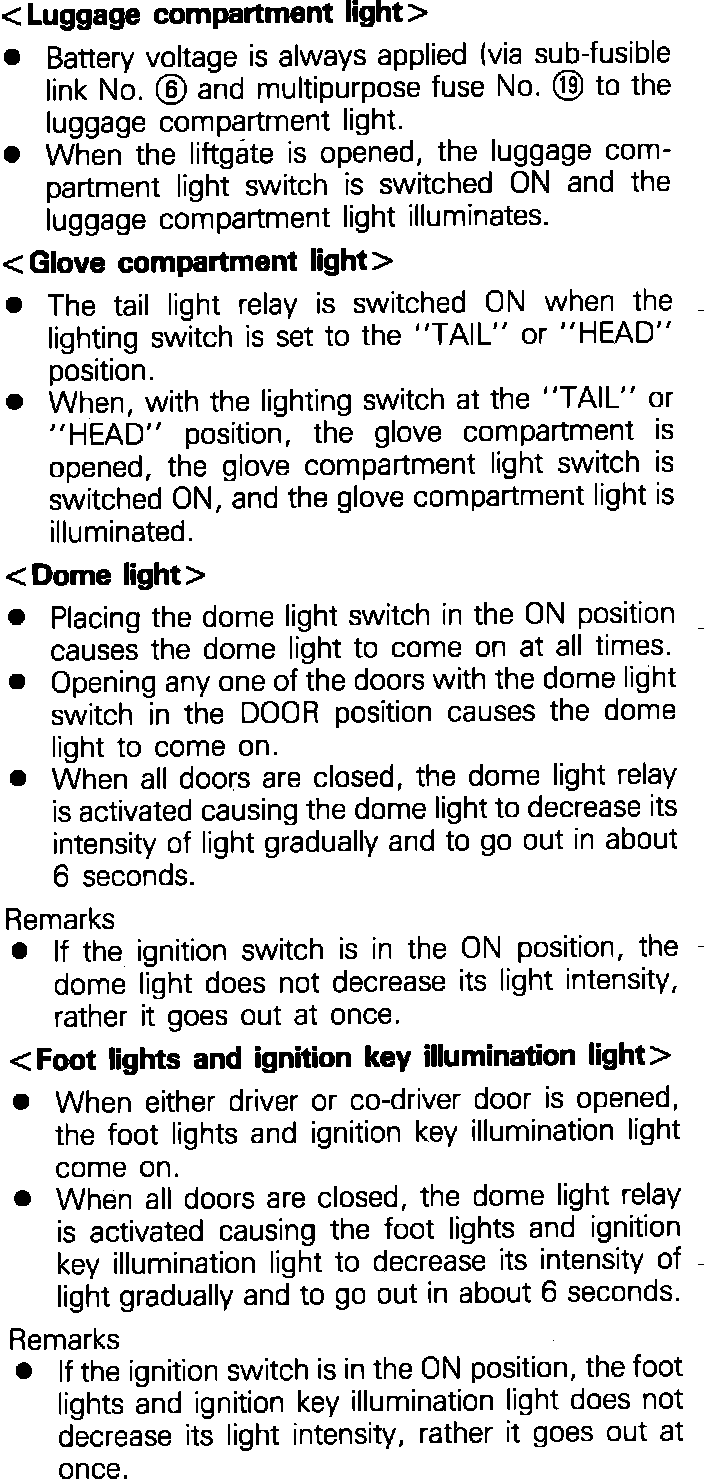 Dome, Igntions Key Illumination, Foot, Glove Box, Door-Alar Warning And Luggage Compartment Lamps: Circuit Operation: