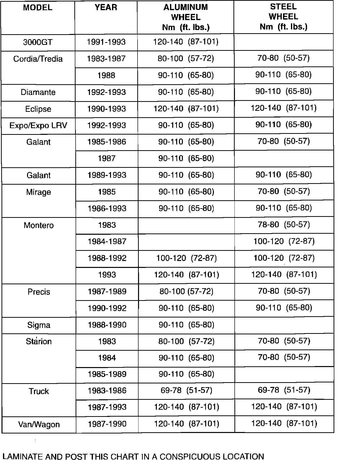 As an aid to technicians, included in this bulletin, is a Wheel Lug Nut Torque specification table for the various vehicles.