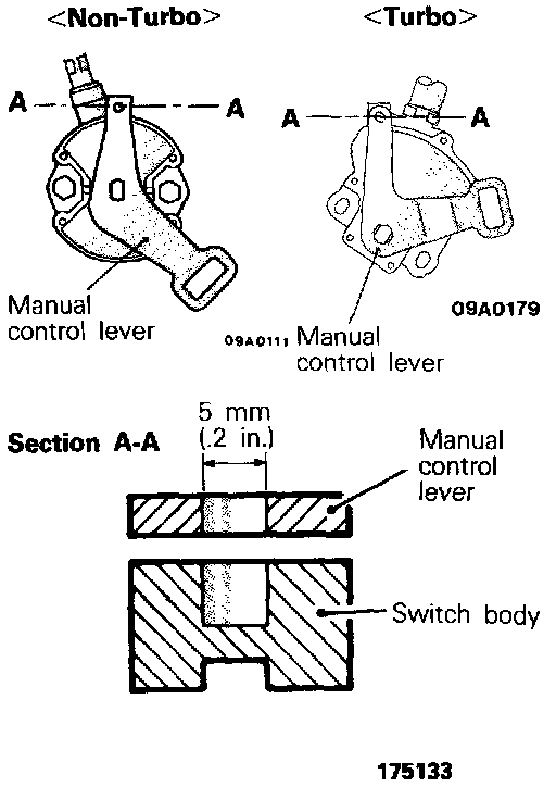 3. To adjust, rotate the switch body so that the manual control lever 5 mm (.2 in.) hole and the switch body 5 mm (.2 in.) hole are aligned.