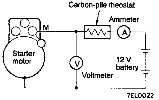 4. Adjust rheostat until battery voltage shown on the voltmeter matches free running test voltage listed under Starter Specifications.