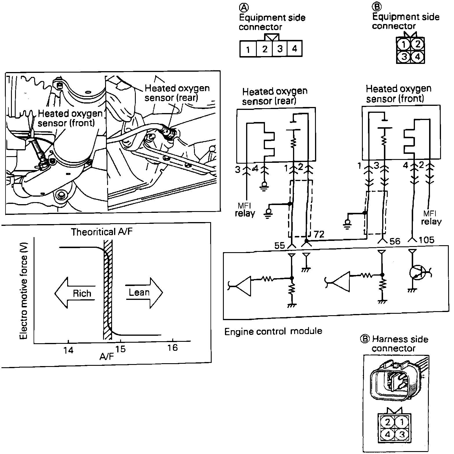 2. Using an Ohmmeter, check for continuity between the ECU harness connector terminal 55 and the oxygen sensor harness connector terminal A1.