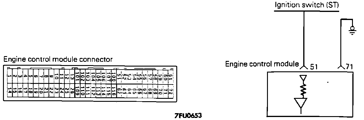 3. Turn the key to the OFF position and check for continuity between ECM harness connector terminal 71 and ground.