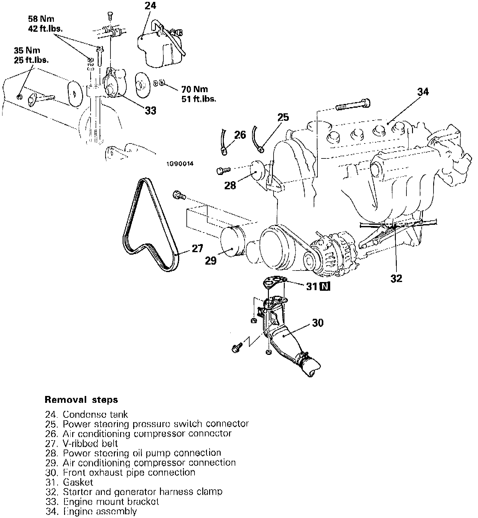 b. Remove air conditioner compressor with hoses attached, then support aside.