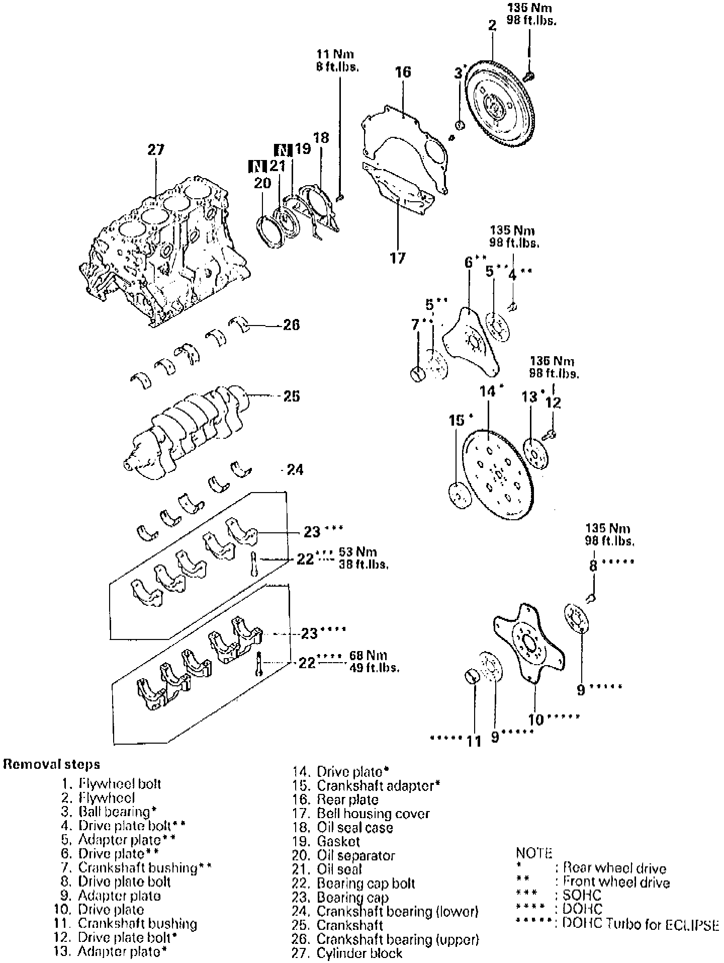 j. On automatic transmission models, install adapter plates and driveplate, then tighten bolts to specification.