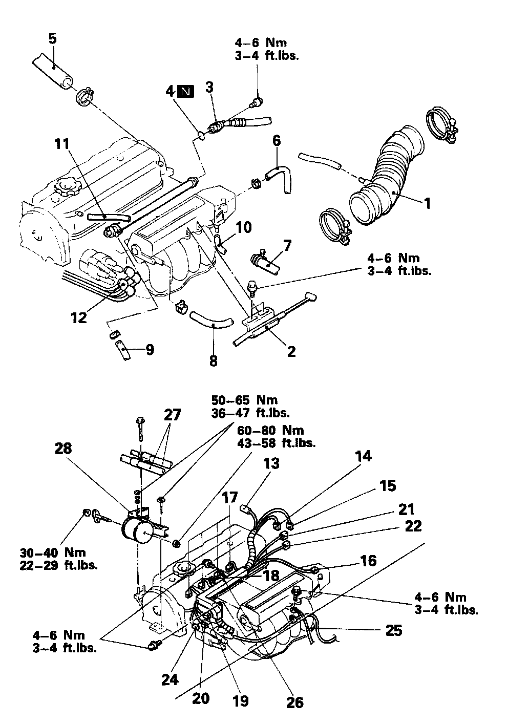 18. Connect the fuel return hose (9), the brake booster vacuum hose (8), the heater hose (7), and the water by-pass hose (6).