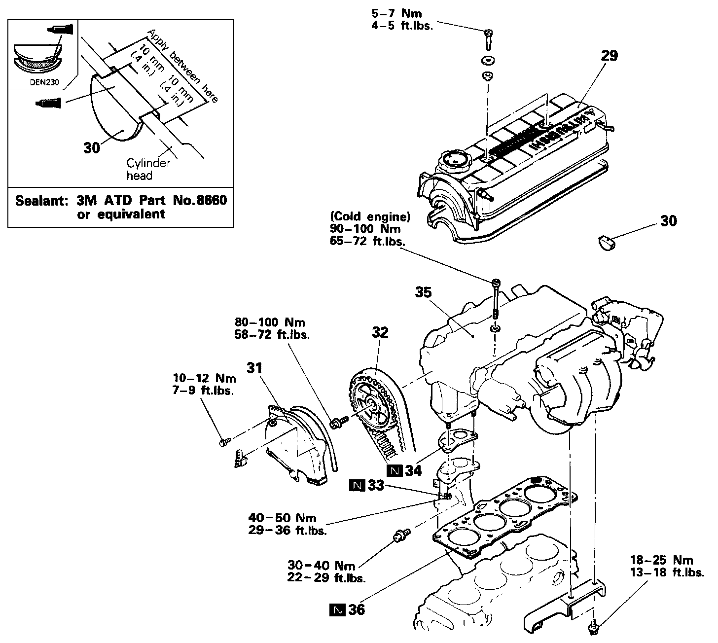 9. Using a new gasket, install the semi circular packing (30) and install the valve cover (29). Torque nuts to 5 - 7 Nm (4 - 5 ft.lbs).