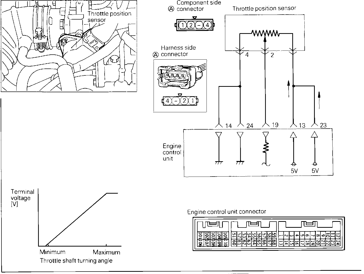 As the throttle shaft rotates, the output Voltage of the TPS changes. The ECU determines the throttle valve opening based on the output Voltage. The ECU computes throttle valve opening change (output Voltage change) and judges the engine acceleration state and accordingly corrects fuel injection amount during acceleration.