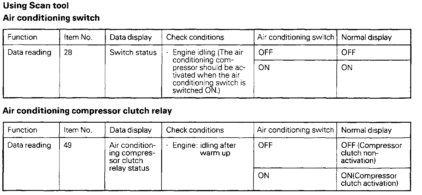 If the air conditioning compressor's magnetic clutch is not activated when the air conditioning switch is switched ON during idling, it is probable that the cause is a malfunction of the air conditioning control system.
