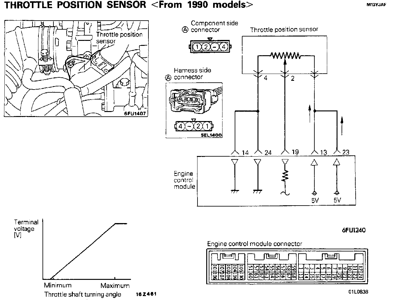 The 5V power supply within the engine control module is supplied to the throttle-position sensor, after which it passes through the resistance within the sensor and is grounded at the engine control module.