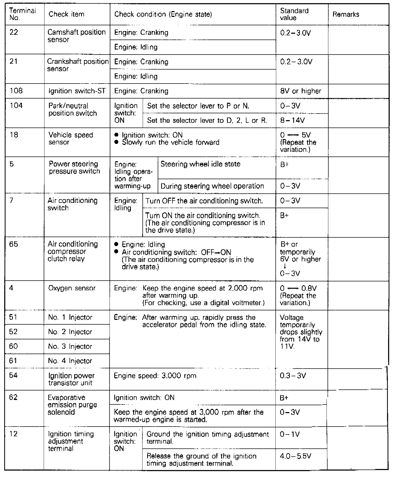 2. Measure the Voltage across each terminal to the terminal No. 106 (ground terminal).
