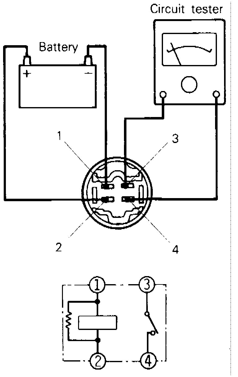 3. When battery voltage is applied, continuity should exist between terminals 3 and 4 but should not exist when voltage is removed. Continuity should also exist between terminals 1 and 2 when voltage is removed.