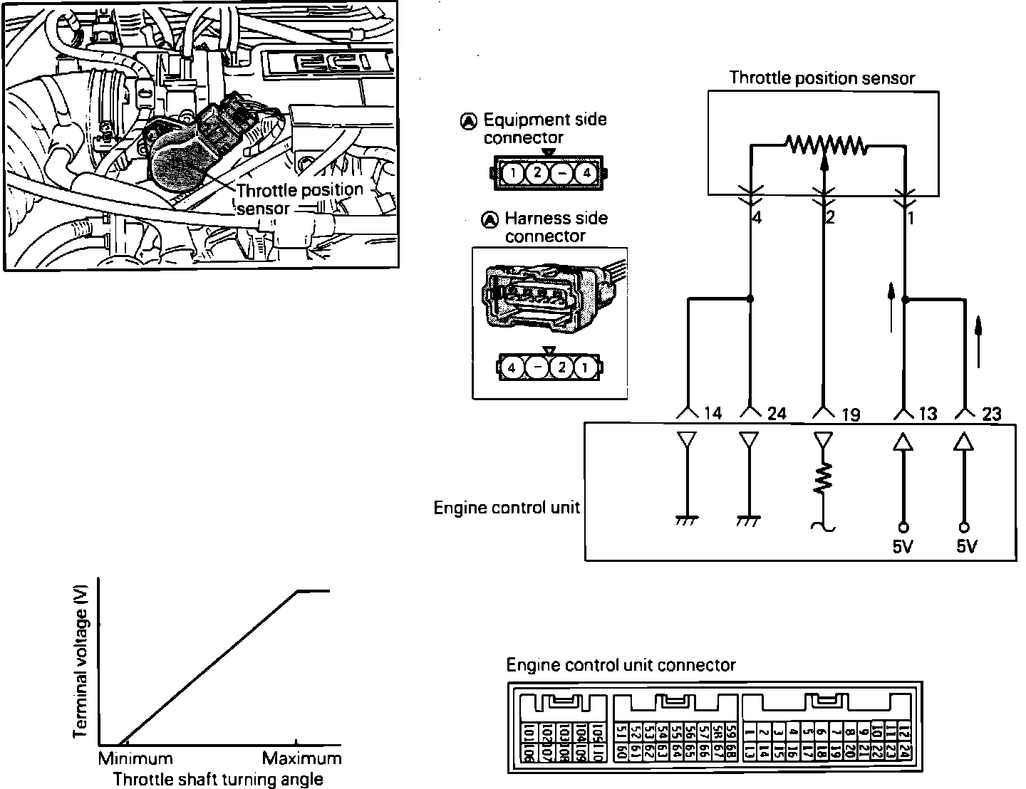 As the throttle shaft rotates, the output voltage of the TPS changes. The ECU determines the throttle valve opening based on the output voltage. The ECU computes throttle valve opening change (output voltage change) and judges the engine acceleration state and accordingly corrects fuel injection amount during acceleration.