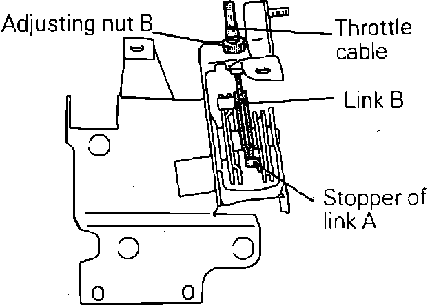7. With the end of link B in contact with the stopper of link A, adjust the play of the throttle cable (inner cable) to the standard adjustment using adjusting bolt B.