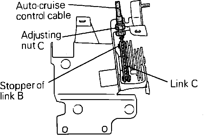 9. With the end of link C in contact with the stopper of link B, adjust the play of the cruise control cable (inner cable) to the standard adjustment using adjusting nut C.