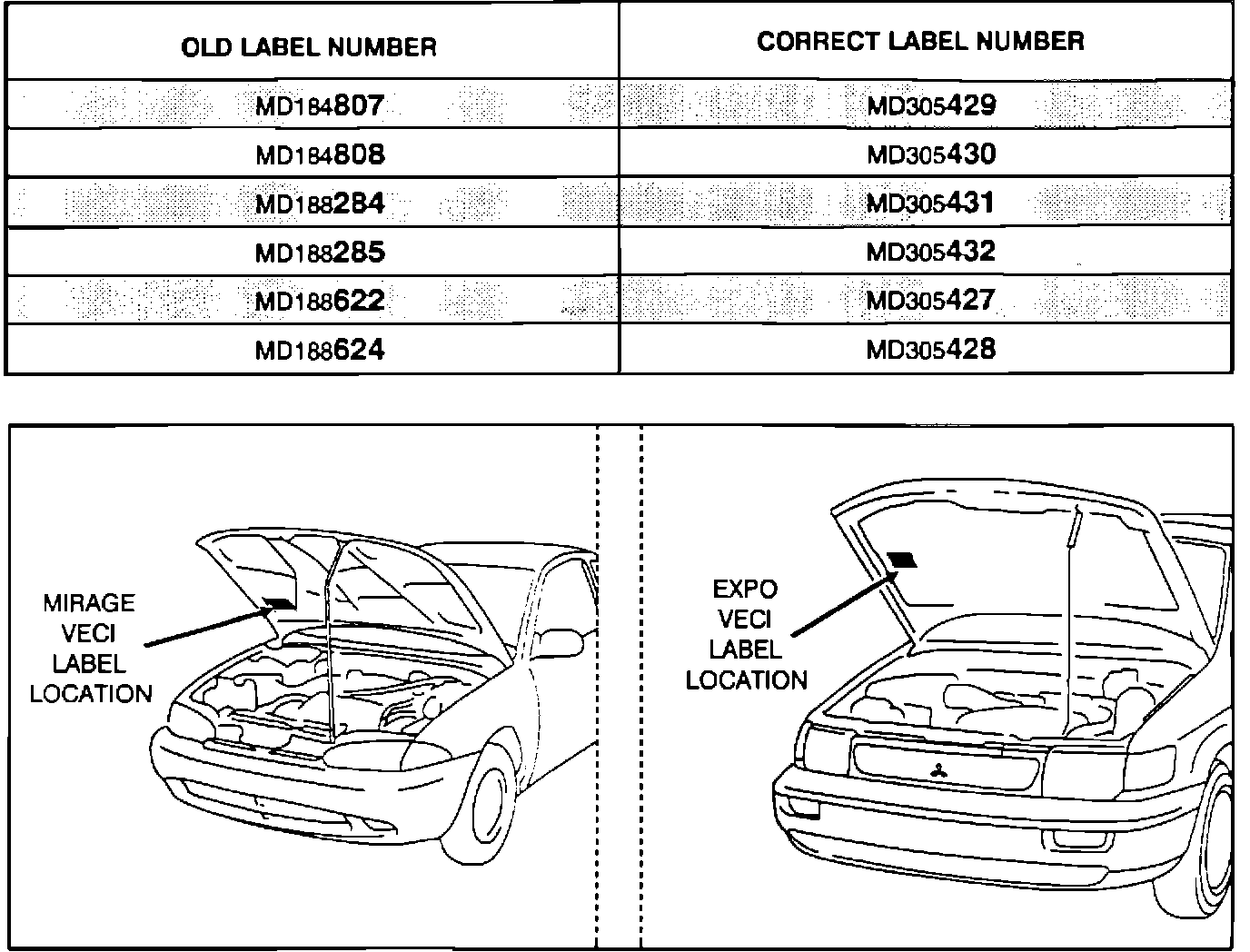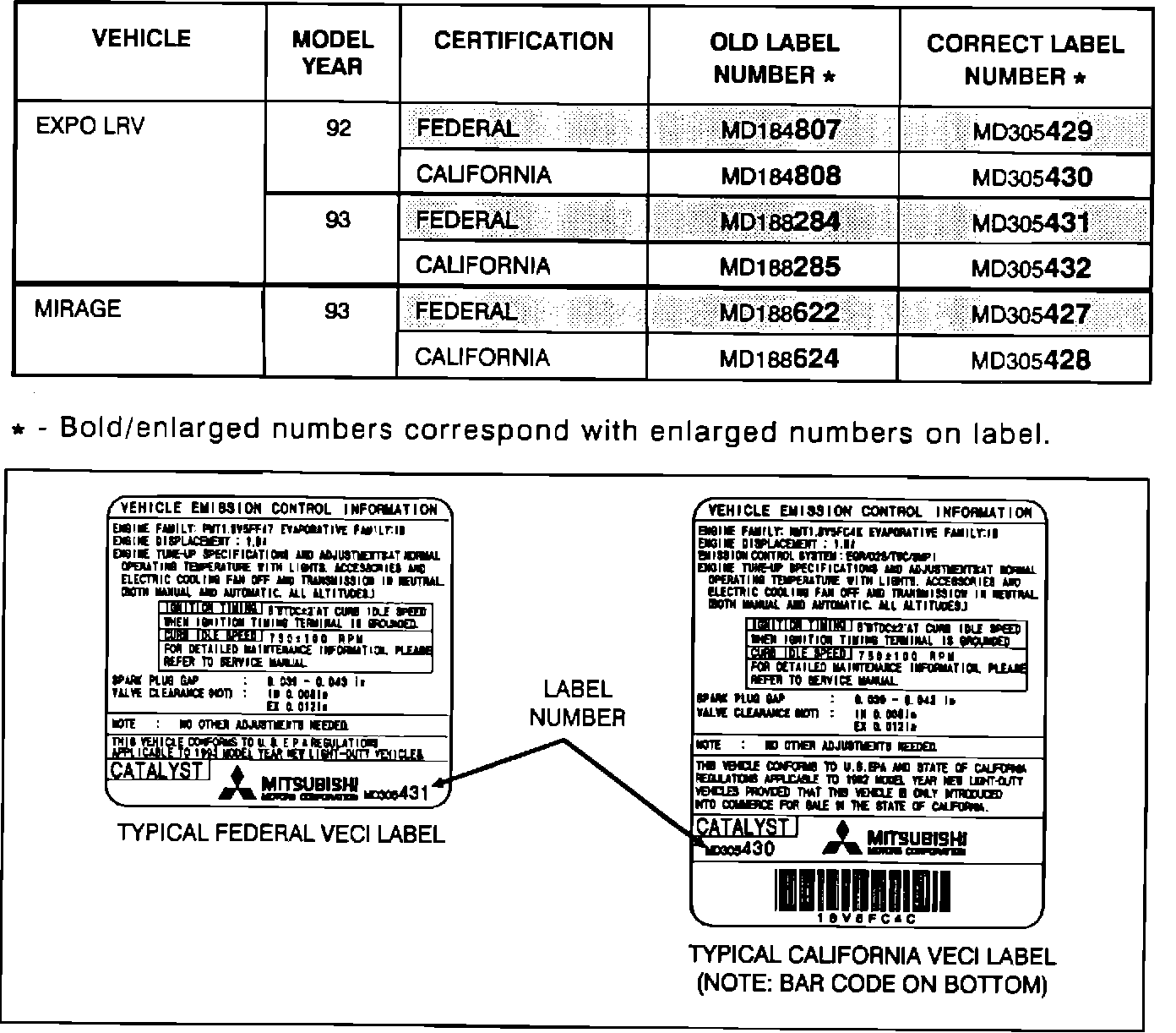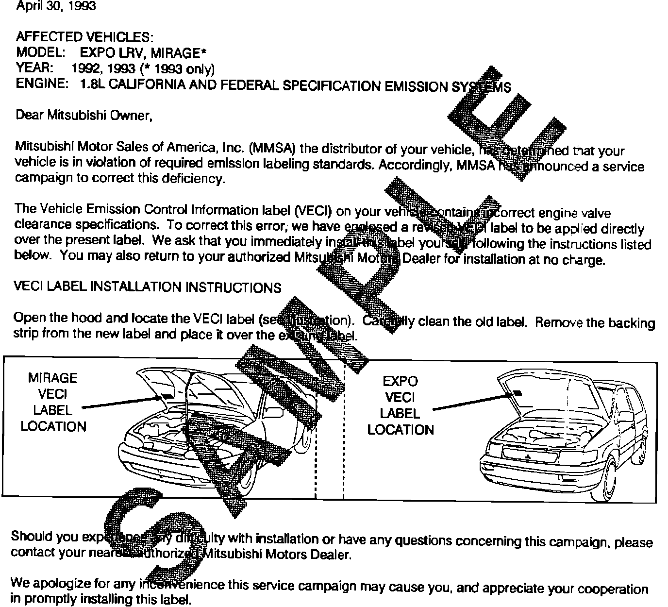The Vehicle Emission Control Information (VECI) label must be replaced on a limited number of 1992-93 Expo LRV and 1993 Mirage vehicles equipped with a 1.8L engine. The old label shows an incorrect valve adjustment specification. A letter, with label enclosed, has been sent to the affected vehicle owners instructing them to install the VECI label themselves. A sample customer notification letter appears in this bulletin. Vehicle owners who do not want to install the new label themselves have been advised by Mitsubishi Motor Sales of America, Inc. (MMSA) to ask their Mitsubishi Motors dealer to install the label, at no charge.