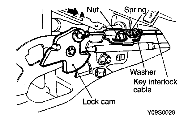 c) While lightly pushing the cable coupling portion of the lock cam in the direction A, tighten the nut to fasten the key interlock cable.