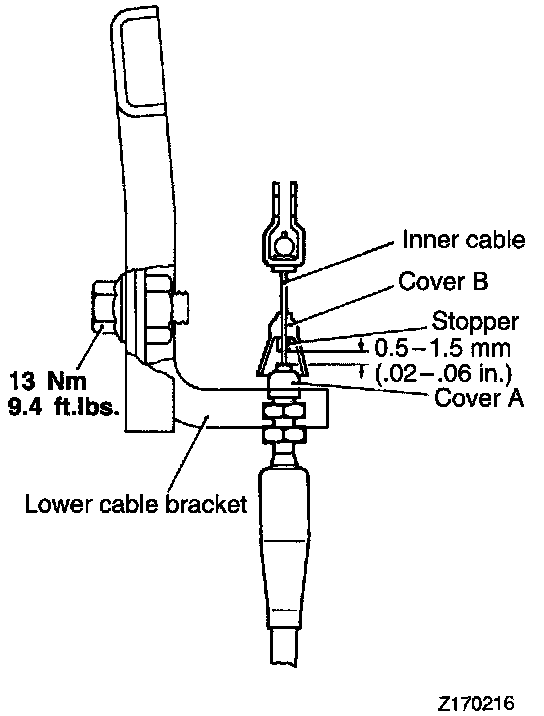After adjustment, tighten the lower cable bracket mounting bolt to the specified torque.