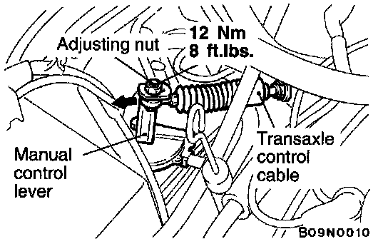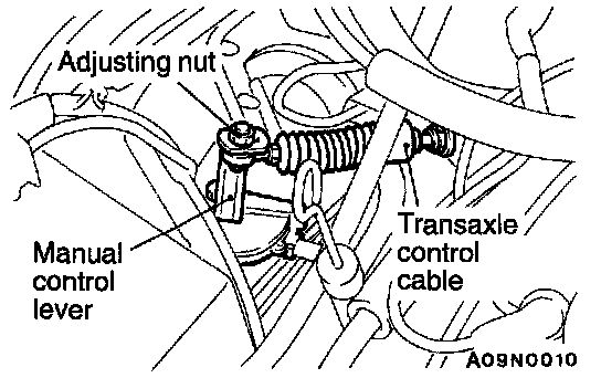 - Loosen the transaxle control cable to manual control lever coupling nut to free the cable and lever.