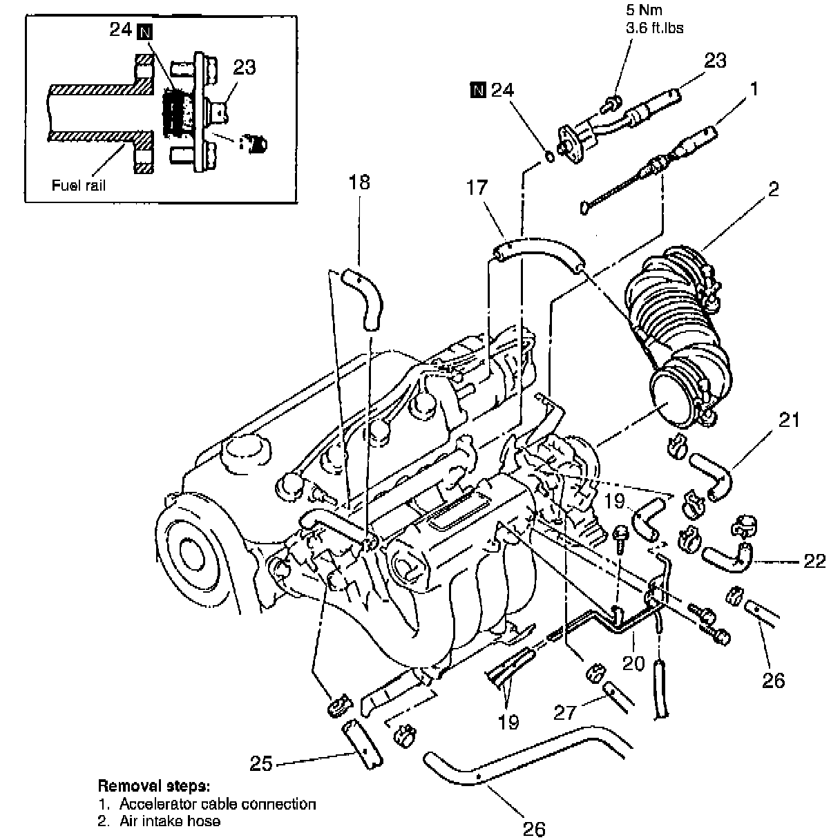 4. Remove intake manifold in numbered sequence shown in Fig. 3, removing fuel delivery pipe leaving injectors and pressure regulator intact. Do not drop injector when removing delivery pipe.