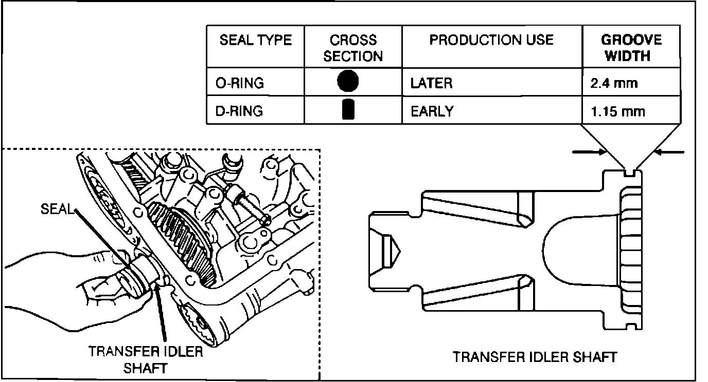 This bulletin is issued to inform service technicians of different (early vs late production) transfer idler shaft seals used in 1993 Mirage F3A21 and F3A22 (3-speed) automatic transaxles. Early production 1993 Mirage vehicles (manufactured through August 1992) use a "D-Ring" to seal the transfer idler shaft. Later production vehicles (manufactured after August 1992) use an "O-Ring" to seal the transfer shaft.