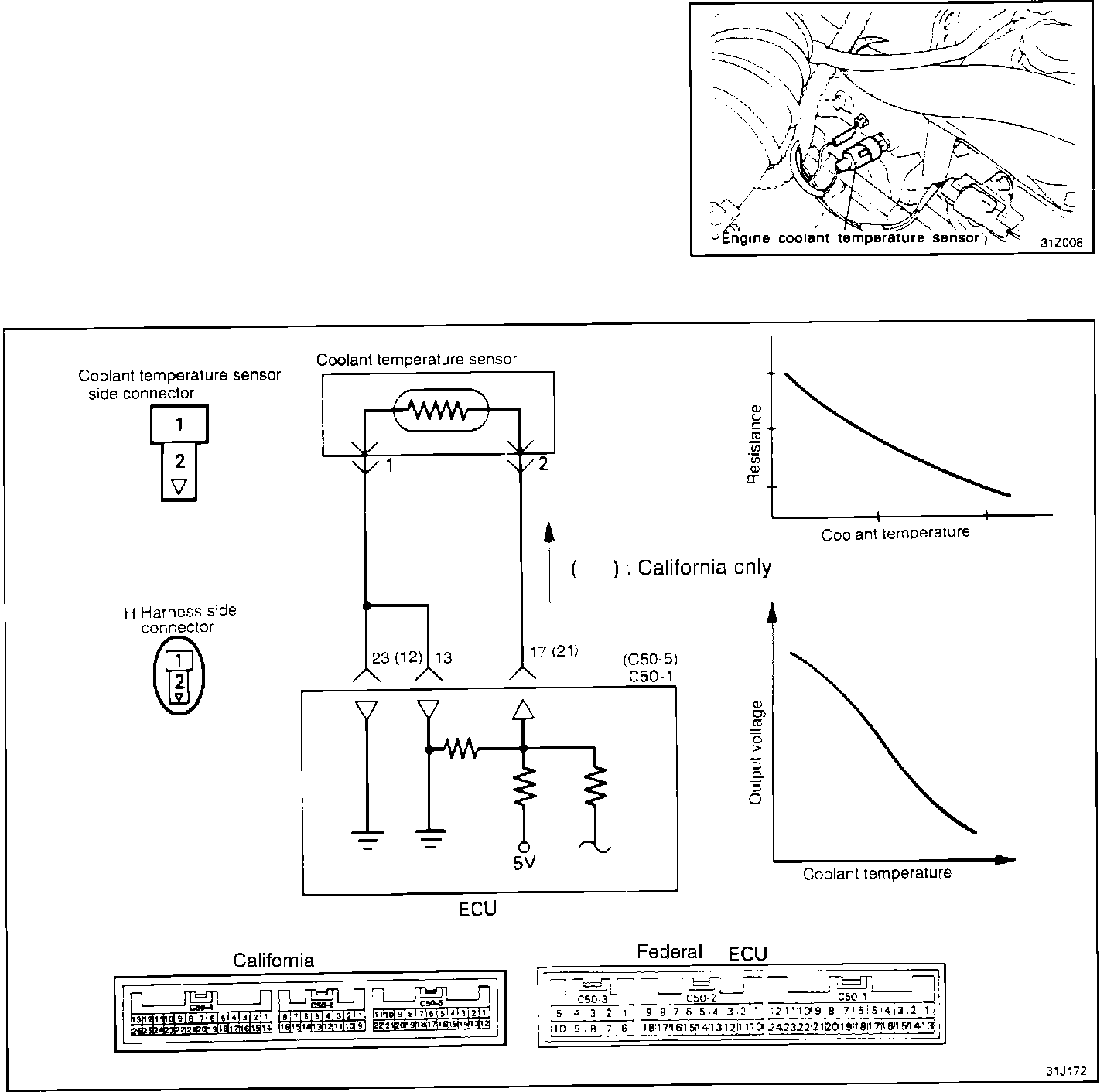 As engine temperature increases, sensor resistance decreases. The ECU monitors engine temperature by the sensor output voltage and provides optimum fuel enrichment when the engine is cold.
