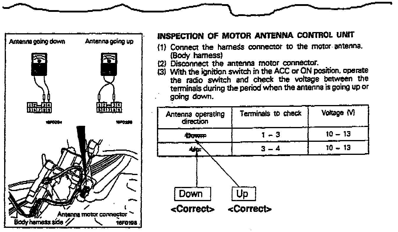 The inspection procedures for the antenna motor control unit in the 1991 and 1992- 96 3000GT Service Manuals, Volume 2, contain some incorrect data. The "Antenna operating direction" on the chart is reversed. Make corrections to the manual according to the information in this bulletin.