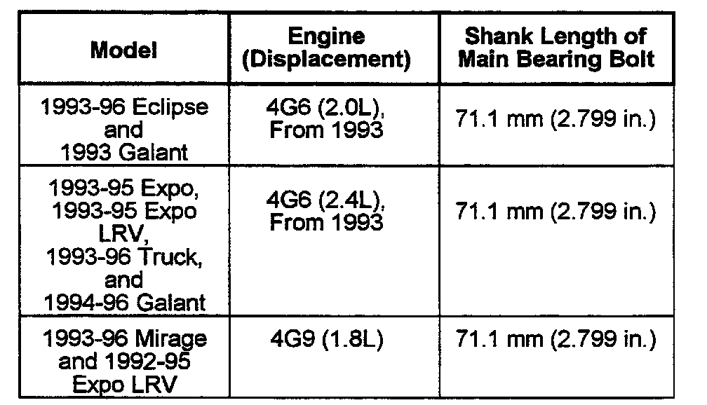Two types of main bearing bolts are used on the engines of 1992-96 vehicles: non-elastic and elastic. Before installing either type of bolt, coat the bolt threads with clean engine oil.NOTE: